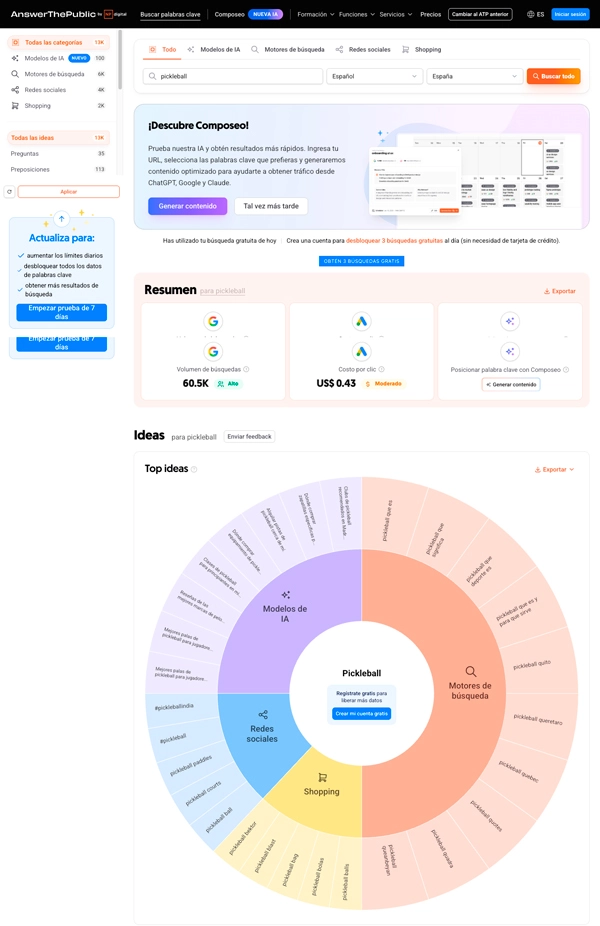 De manera gratuita, tendrás 3 búsquedas diarias, lo que es perfecto para encontrar ideas de contenido. Si te registras, tendrás un mayor número de búsquedas y funcionalidades.